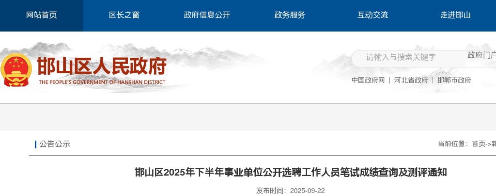 原标题:邯山区2025年下半年事业单位公开选聘工作人员笔试成绩查询及测评通知